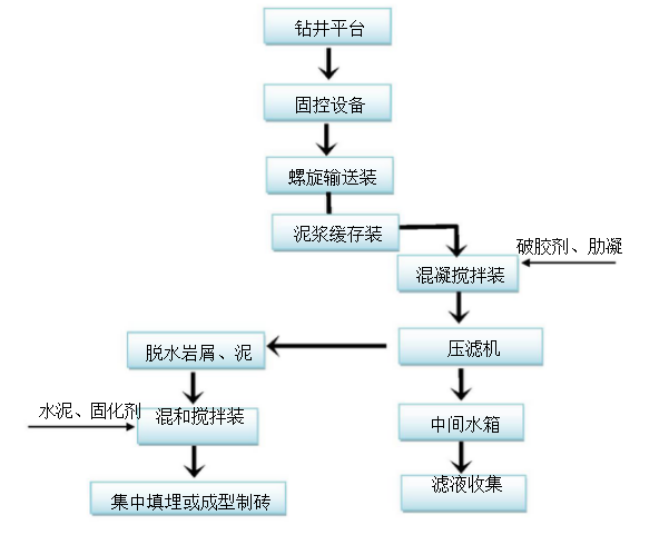 鉆井作業(yè)經(jīng)振動篩、除沙器、離心機分離出的廢棄鉆屑液、泥漿、廢水,經(jīng)螺旋輸送機送至泥漿緩存收集裝置。鉆井作業(yè)至泥漿層時出料以泥漿和鉆井液為主,用泵經(jīng)管道混合器加破膠劑、劑藥送至混凝罐進行破膠、絮凝,使泥漿中的液相和固相分離,壓濾機進行固液分離,泥餅收集送至儲存場地。再集中填埋,分離液進入高效一體機, 高效一體機集氧化、還原、絮凝、氣浮和HS—ACF—Fenton于一體,進而達到分解、脫穩(wěn)、絡(luò)合、吸附、凝聚、浮除、沉淀等目的,出水經(jīng)過濾后可直接送入市政污水處理廠作進一步處理,再經(jīng)吸附凈化裝置,使出水達到國家排放標準,達